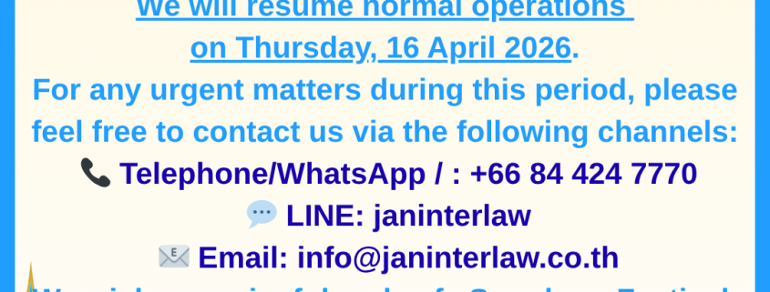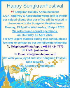 J.A.N. Attorney & Accountant would like to inform our valued clients that our office will be closed in observance of the Songkran Festival from Monday, 13 April to Wednesday, 15 April 2026.